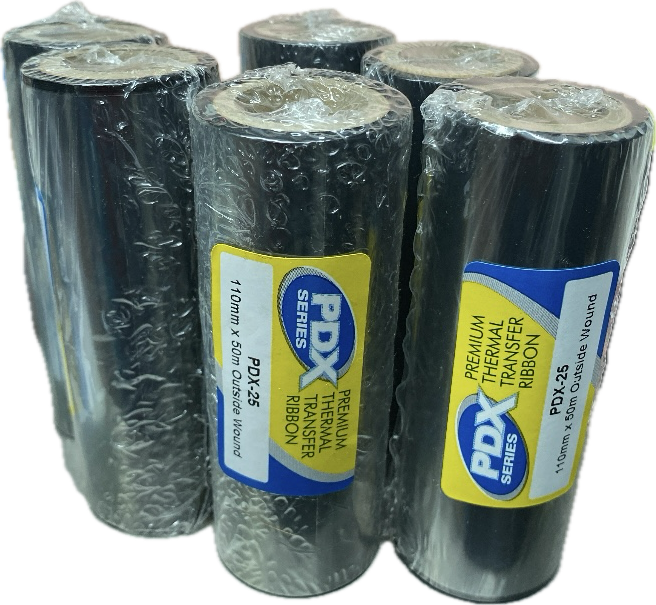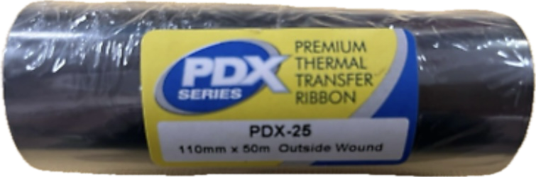 Premium resin thermal transfer ribbon designed for high-quality, durable printing. The PDX-25 ribbon produces sharp, long-lasting prints that are resistant to abrasion, chemicals, and heat, making it ideal for demanding industrial and commercial applications.