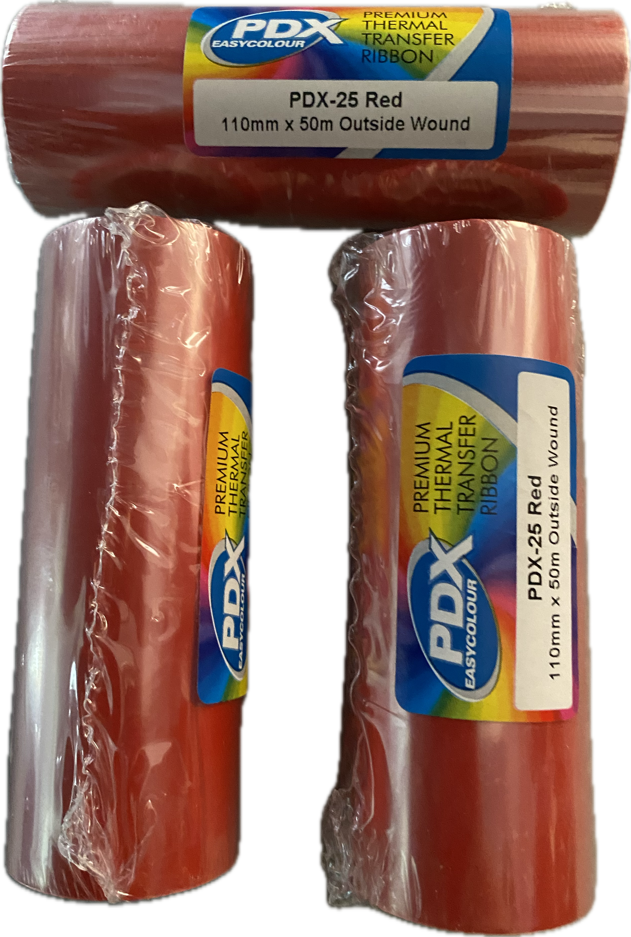 Premium resin thermal transfer ribbon designed for high-quality, durable printing. The PDX-25 Red ribbon produces sharp, long-lasting prints that are resistant to abrasion, chemicals, and heat, making it ideal for demanding industrial and commercial applications.